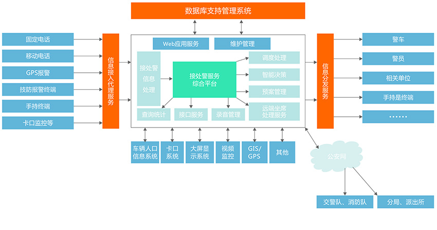 系統以計算機網絡系統為基礎,以有線和無線系統通信系統為紐帶,以接處警應用系統為核心,集成了GIS地理信息系統、通訊調度子系統、數字錄音錄時子系統、首長指揮子系統、輔助決策子系統、數據管理子系統、技術防范報警子系統、大屏幕顯示子系統、圖像監(jiān)控子系統、GPS衛(wèi)星定位系統、大型數據庫系統等,體現了高科技與公安業(yè)務的完美結合,同時也充分考慮了擴展性、維護性以及適用性。